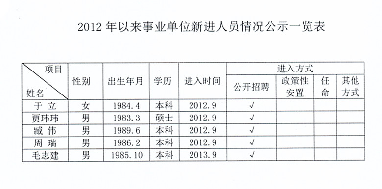 根据《关于开展整治事业单位公开招聘突出问题专项行动的通知》(鲁人社字〔2014〕511号)要求,我院对2007年实行公开招聘制度以来新进人员情况进行了逐一审核,现将2012年以来新进人员进行公示。