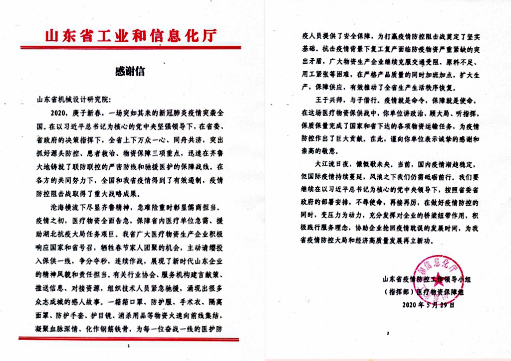 5月29日,山东省疫情防控工作领导小组医疗物资保障组向山东省机械设计研究院发来感谢信,对在疫情防控工作中做出的巨大贡献表示诚挚的感谢和崇高的敬意。