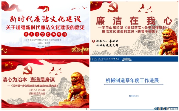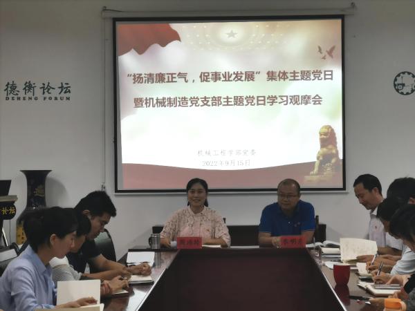 9月15日下午,机械工程学部组织了主题为“扬清廉正气,促事业发展”的集体主题党日活动,活动采取线上线下结合进行的方式,采用由机械制造党支部承办、学部全体党员参与的新模式进行。学部全体党委委员、纪委委员及全体党员参加,机械制造党支部还邀请了本系非党员教师一同参加。活动由党委委员、正处级组织员周玮玲主持。