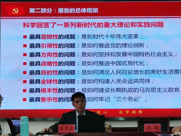 吴笑兵强调,要全面贯彻落实习近平新时代中国特色社会主义思想,认真贯彻落实习近平总书记关于深入学习宣传贯彻党的二十大精神的重要指示精神,按照中央决策部署、省委和校(院)党委工作要求,高标准高质量开展好宣讲工作,推动党的二十大精神深入人心。为下一步工作的开展提了四点要求:一是提高政治站位,深刻认识党的二十大的重大意义。要站在坚定捍卫“两个确立”、坚决做到“两个维护”的政治高度,矢志不渝忠诚核心、拥戴核心、维护核心、捍卫核心,不断提高政治判断力、政治领悟力、政治执行力。要从“关键少数”带头学起,先学一步、深学一层,示范推动学部各单位各部门层层跟进,把学习贯彻党的二十大精神不断引向深入。要在科学统筹“时与势”中坚定“自信自强”,深刻认识新机遇、新使命、新任务,坚定信仰信念信心、做到确认确信确胜,以新的伟大奋斗创造新的伟业。二是坚持学深悟透,准确把握党的二十大精神的核心要义。要坚持原原本本学、深入思考学、全员覆盖学、创新载体学,把贯彻落实党的二十大精神贯穿到日常工作的全过程各方面,切实把思想和行动统一到党的二十大安排部署上来。要坚持系统深入学习习近平新时代中国特色社会主义思想,在学懂弄通做实上下大功夫、真功夫、实功夫,吃透精神实质,把思想统一到党的最新理论成果、实践成果、制度成果上来。要以党的二十大精神为指引,全面贯彻党的教育方针,坚持立德树人根本任务,充分发挥“课程思政”的教育作用,推动党的二十大精神进课堂、进头脑。三是做到走深走实,营造学习贯彻党的二十大精神的浓厚氛围。要谋划制定工作方案,有计划、分步骤抓好实施,推动党的二十大精神家喻户晓、深入人心,切实用党中央决策部署统一思想、意志和行动。要精心组织加强宣传,多角度、全方位宣传解读,充分发挥领导干部作用,采取群众喜闻乐见的方式、用群众听得懂的语言,把党的二十大精神传达到全体师生。要充分用好网络手段,大力宣传学部学习贯彻的具体举措和实际行动,反映师生员工学习贯彻的典型事迹和良好风貌,努力营造出学习宣传贯彻党的二十大精神的浓厚氛围。四是做到见行见效,奋力推动党的二十大精神全面贯彻落实。要增强学思践悟党的创新理论的自信自觉,努力把习近平新时代中国特色社会主义思想融入血脉、植入灵魂,坚持好、运用好贯穿其中的立场、观点和方法。要把学习宣传党的二十大精神和推动当前各项工作有机结合起来,全力实施“1248”发展思路,提高学部教学和科研水平,全面激活学部发展动力。要以学习宣传贯彻党的二十大精神为动力,聚力攻坚,奋勇争先,以实际工作成绩检验学习贯彻成效,坚定不移完成好今年党建和业务工作的各项指标任务。要持续改进工作作风,激发工作热情,坚持不懈推进博士点建设、全力以赴推动工作、毫不放松做好安全稳定工作、科学精准谋划好明年工作。