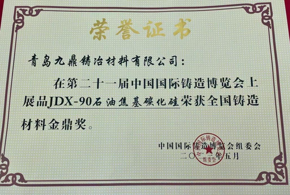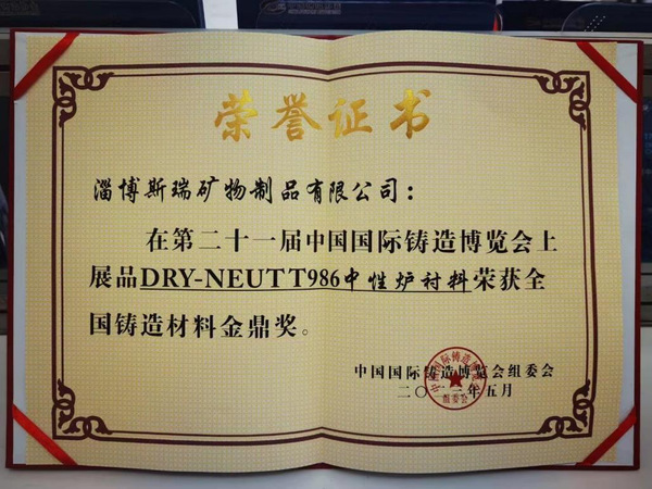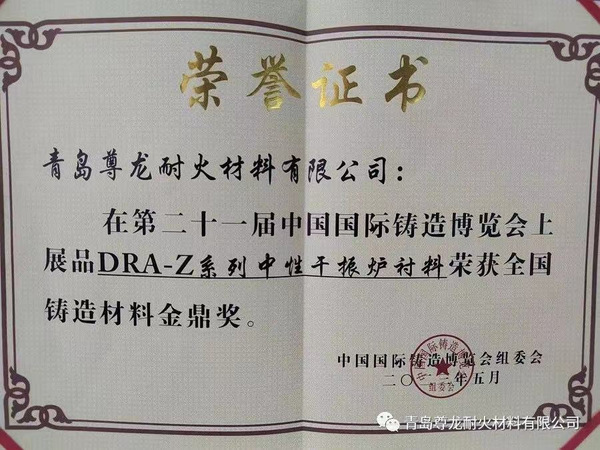 淄博斯瑞矿物制品有限公司生产的DRY-NEUT中性炉衬料、青岛九鼎铸冶材料有限公司生产的JDX90石油焦基碳化硅、临沂玫德庚辰金属材料有限公司生产的TD-1生铁、玫德集团威海有限公司生产的Q10生铁、山东旭光得瑞高新材料股份有限公司生产的铸元素Ⅱ粘土砂添加剂、青岛尊龙耐火材料有限公司生产的DRA-Z系列中性敢振炉衬料均获得了铸造材料金鼎奖。