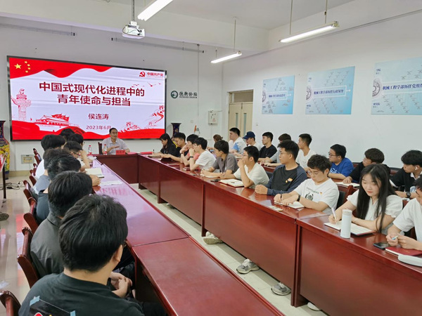 侯连涛以《中国式现代化进程中的青年使命与担当》为题,运用通俗易懂的语言、生动形象的事例,从如何认识中国式现代化、认真学习中国式现代化的必要性以及青年人的在中国式现代化中应该如何担负时代使命等三个方面,进行了深入阐述。他指出,青年人是探索中国式现代化的先锋力量,在不同历史阶段都发挥着不可替代的作用,中国式现代化建设中必然离不开青年,勉励大家将青春融入中国式现代化建设中,在实现中国梦的伟大进程中贡献力量。