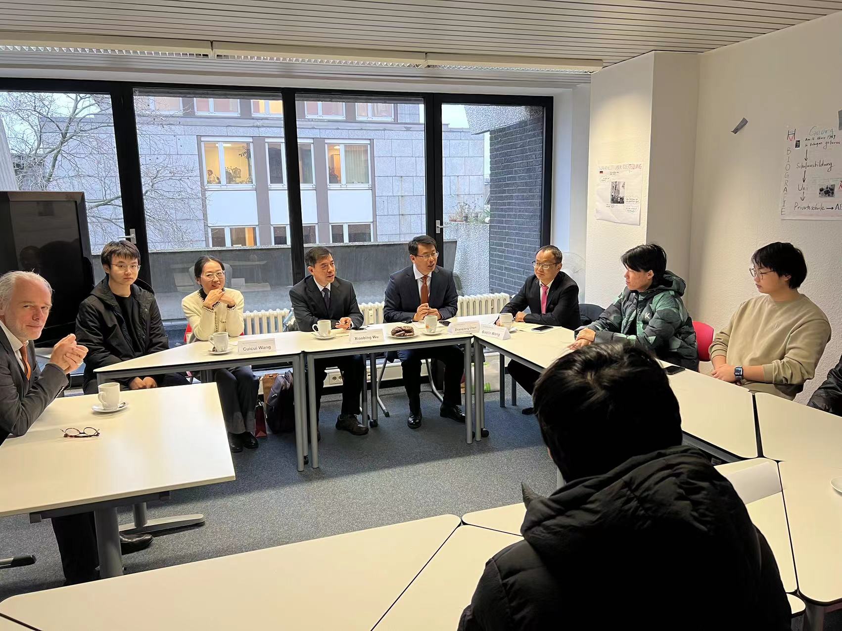 在杜伊斯堡语言学校,吴笑兵一行与校长Dirk Scholten教授等校方人员就如何提升中德合作办学专业学生德语语言教学质量进行了深入探讨,双方在德语教学资源共享、德语外教选派、双方教师访学等方面达成了广泛共识。