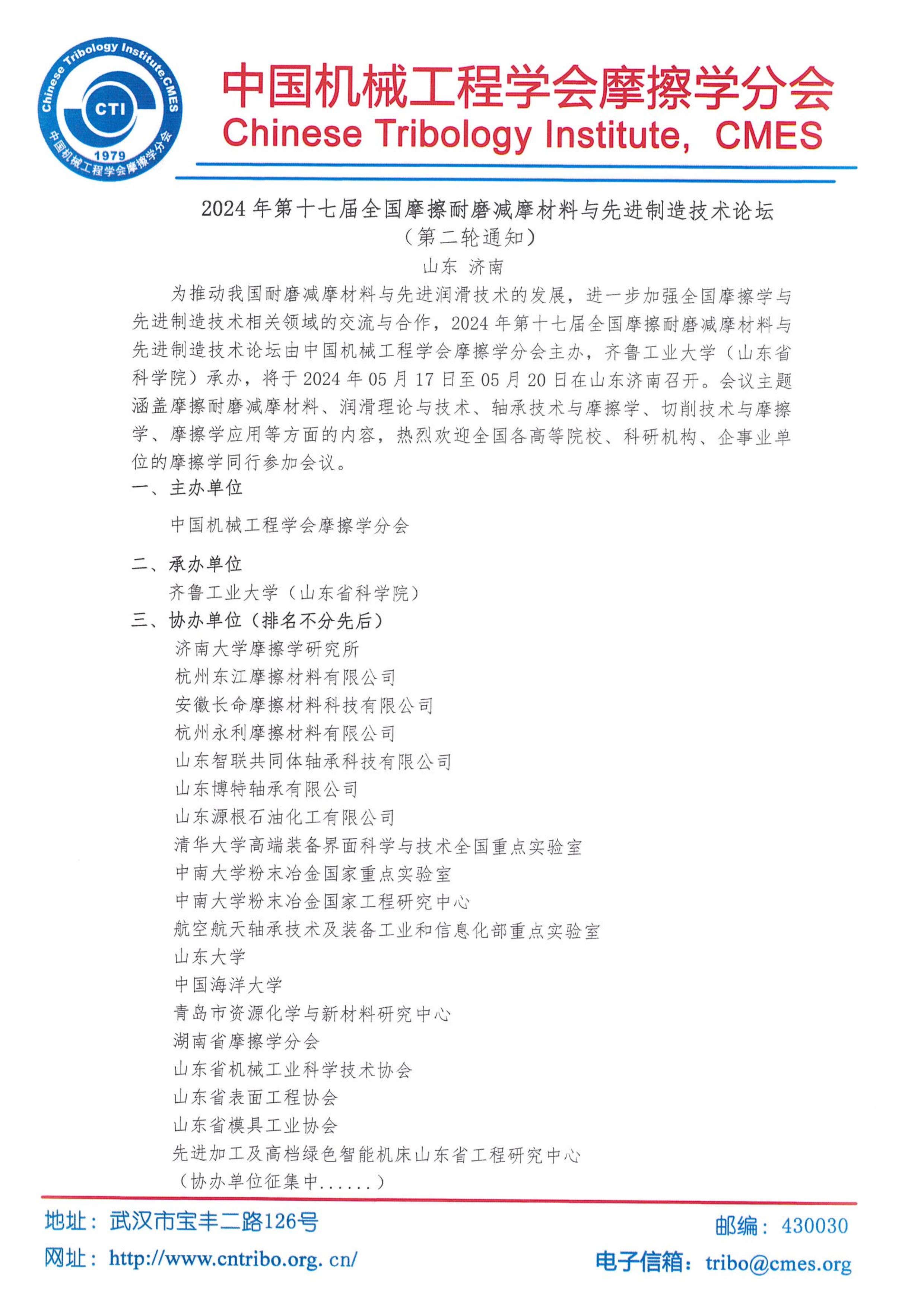 2024年第十七届全国摩擦耐磨减摩材料与先进制造技术论坛 (第二轮通知)