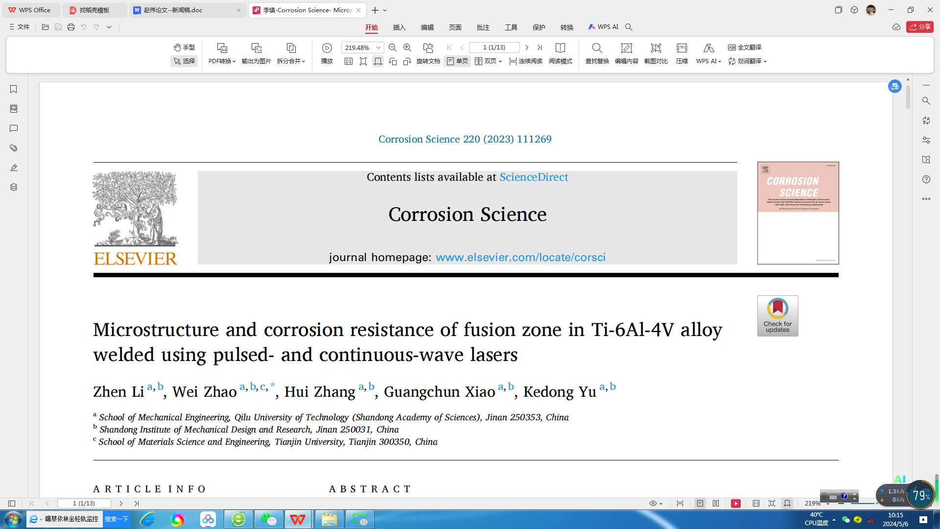 近日,机械工程学部金属增材与再制造创新团队在《Corrosion Science》(中科院一区,TOP期刊)上,发表了钛合金焊接接头可靠性评价方面的研究成果“Microstructure and corrosion resistance of fusion zone in Ti-6Al-4V alloy welded using pulsed- and continuous-wave lasers”。齐鲁工业大学(山东省科学院)机械工程学部研究生李镇为文章的第一作者,赵伟副教授为文章的通讯作者。