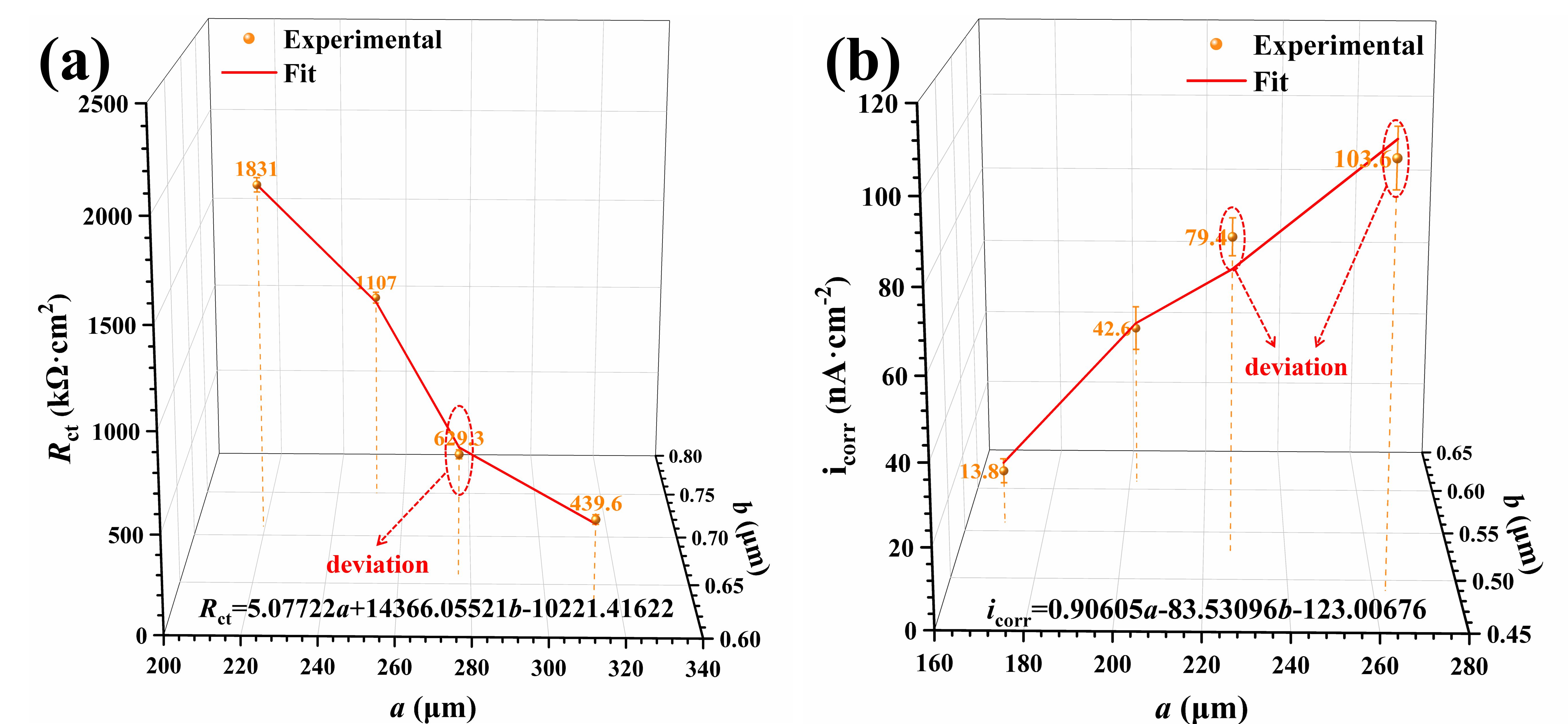 团队研究了采用相同焊接热输入的脉冲波(5, 50, 500 Hz)和连续波焊缝区域的显微组织类型、晶粒尺寸、晶粒取向、大小角度晶界、KAM值等特征,并解析了显微组织的转变机理。同时,利用电化学和微区电化学技术测试了各试样的腐蚀特性。为了探究焊缝区域耐蚀性演变的规律及机理,关联了耐蚀性(用电荷转移电阻Rct和腐蚀电流密度icorr代表)与显微组织结构特征之间的数学关系。明确了影响耐蚀性的主要因素是晶粒尺寸和KAM值,晶粒取向等的影响较小,且α’马氏体宽度对耐蚀性的影响大于原β晶粒尺寸。在研究基础上,解析了TC4钛合金激光焊接接头焊缝区域的腐蚀机理。
