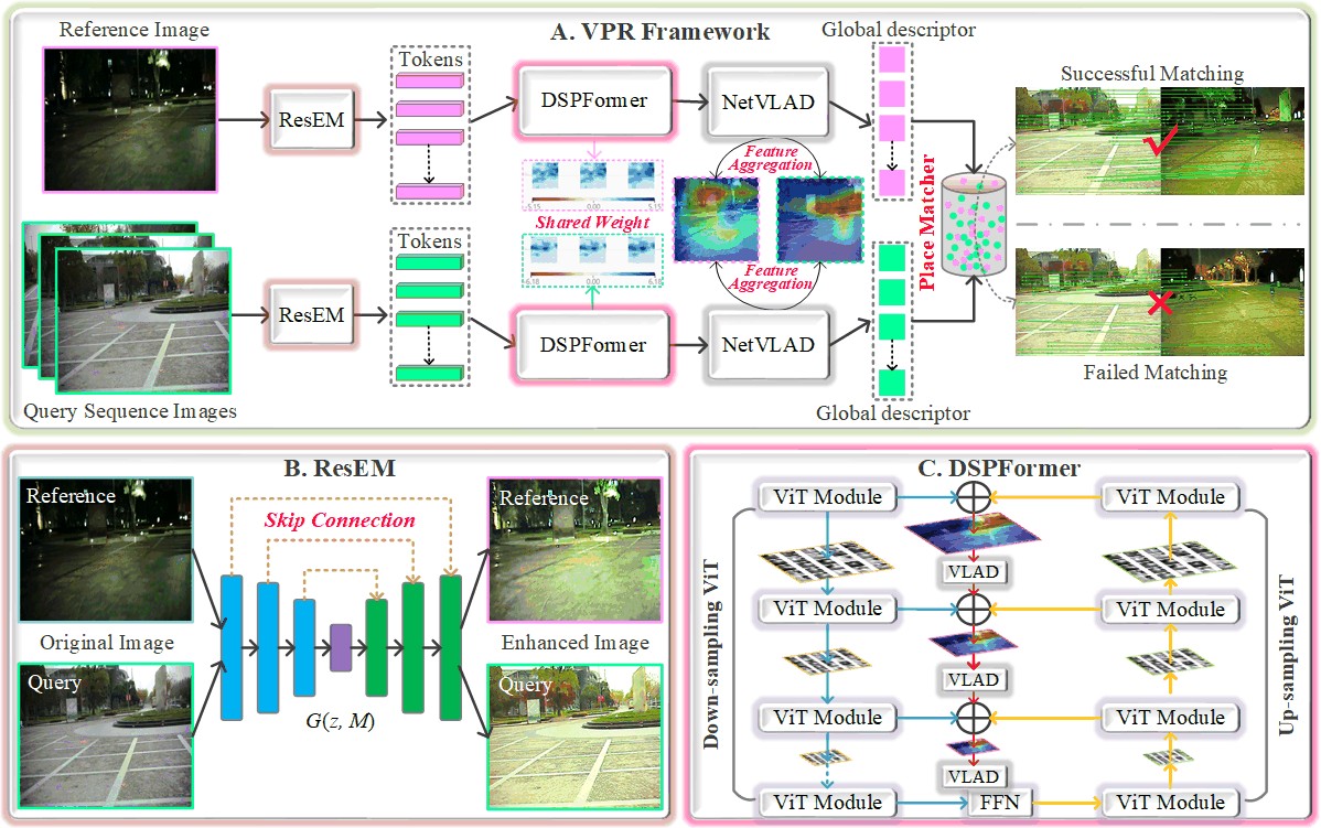 在《IEEE Transactions on Industrial Informatics》发表的论文“Toward Robust Visual Place Recognition for Mobile Robots With an End-to-End Dark-Enhanced Net”,以低光照下环境的移动机器人位置识别为研究对象,通过训练一个轻量级低光照增强网络,利用残差连接的对抗学习模型方法有效改善图像照度质量。在此基础上,构建了双级采样的金字塔变换器,通过聚合重构描述符提取判别特征。此外,还构建了一种基于交叉熵损失的重排名网络,进一步提升位置识别的精度。技术路线如图1所示。