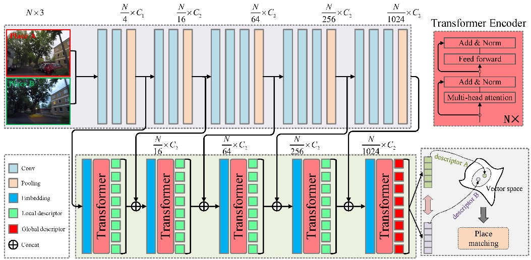 在《Neurocomputing》发表的论文“CSPFormer: A cross-spatial pyramid transformer for visual place recognition”,构建了一种跨空域金字塔转换器,通过将CNN金字塔特征与Transformer多尺度特征融合加权,实现跨空间特征表征。在此基础上,构建多重自注意层,强化多尺度视觉描述符的长期依赖性,降低计算成本,实现更高效的移动机器人视觉位置识别。技术路线如图3所示。