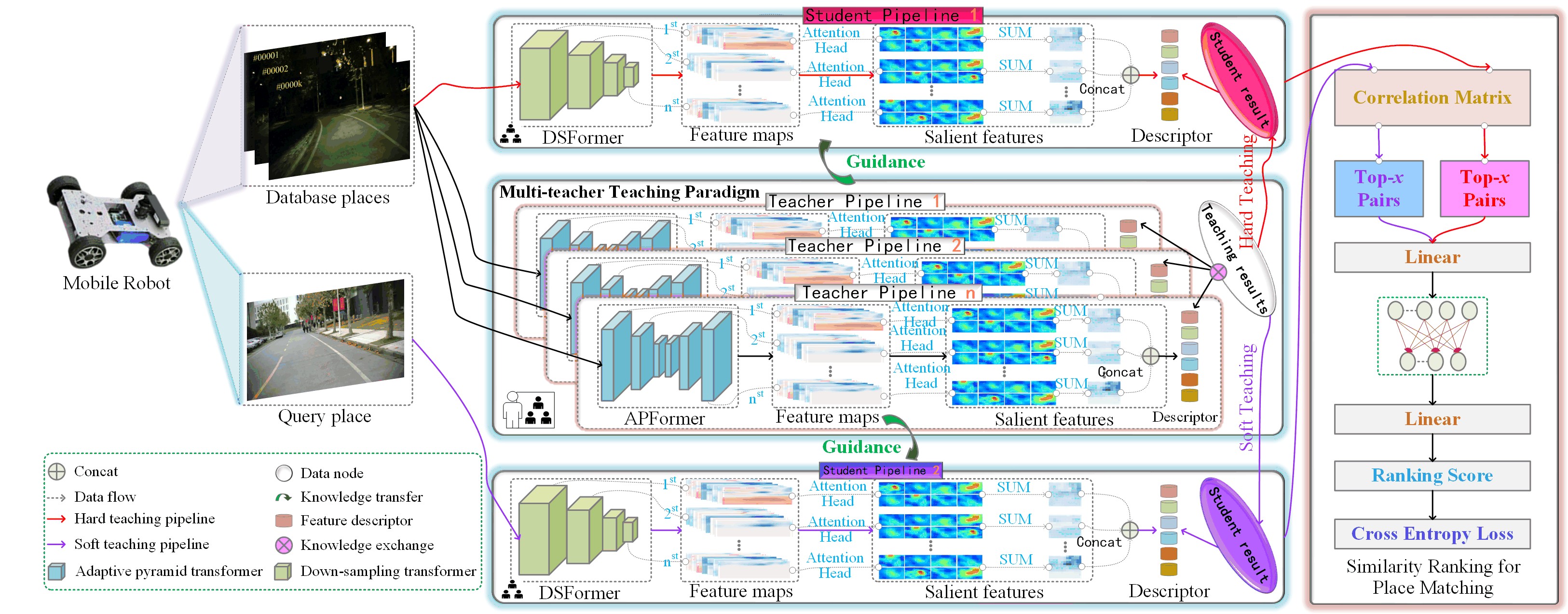 在《IEEE Transactions on Intelligent Transportation Systems》发表的论文“Feature-Level Knowledge Distillation for Place Recognition Based on Soft-Hard Labels Teaching Paradigm”,以全天候机器人位置识别为研究对象,通过从几个“教师网络”到孪生“学生网络”的知识迁移,学习一个紧凑、快速的全天位置识别器。根据环境的复杂程度,“教师网络”可以通过软、硬标签两种教学范式向两类学生迁移知识。为了平衡计算内存和性能,“教师网络”被设计为一个两级采样视觉Transformer管道,而孪生“学生网络”被设计为轻量级管道。技术路线如图2所示。
